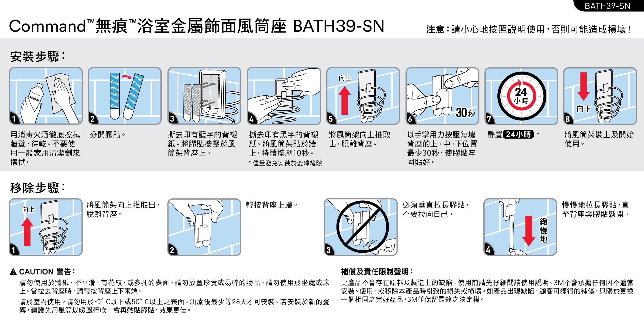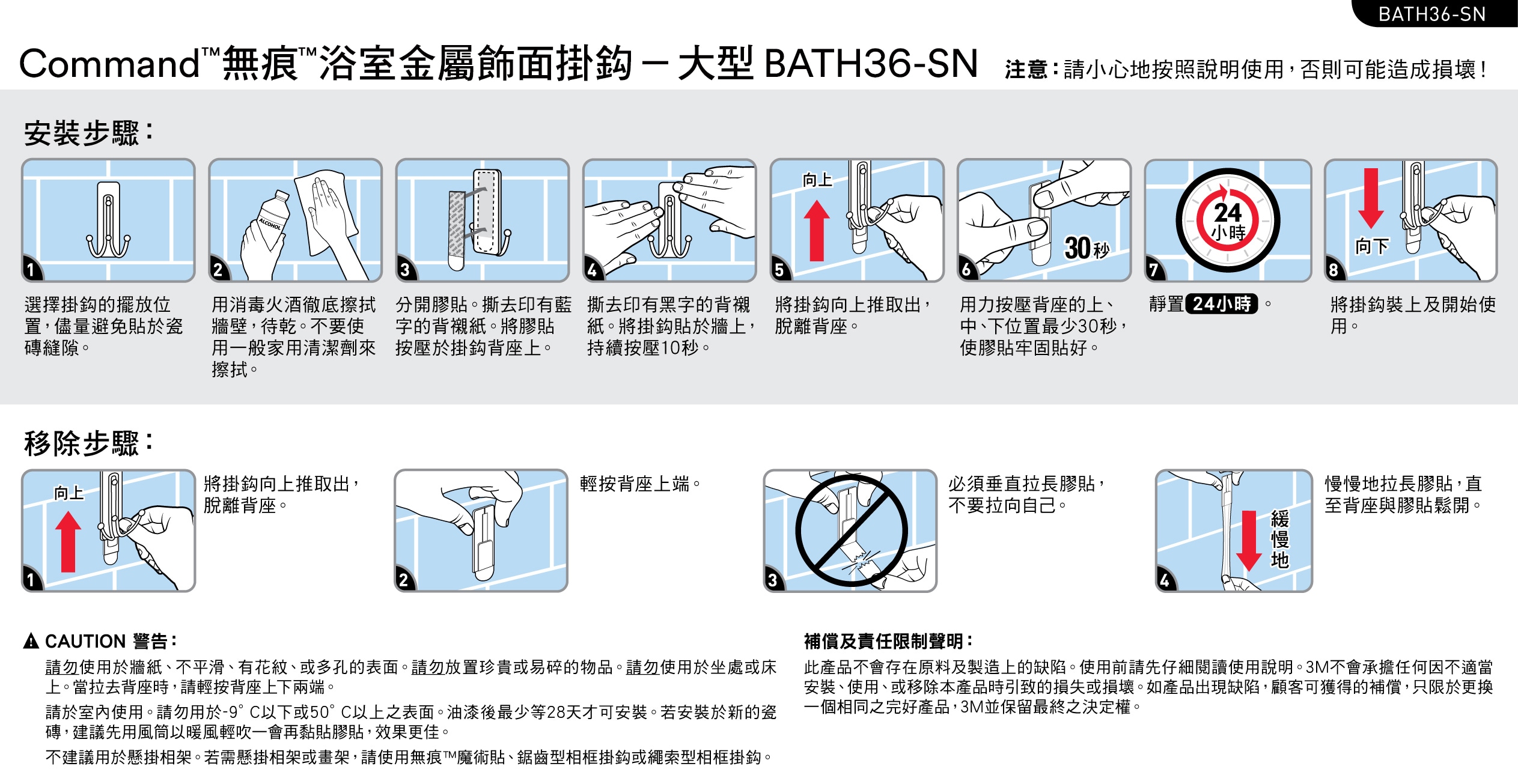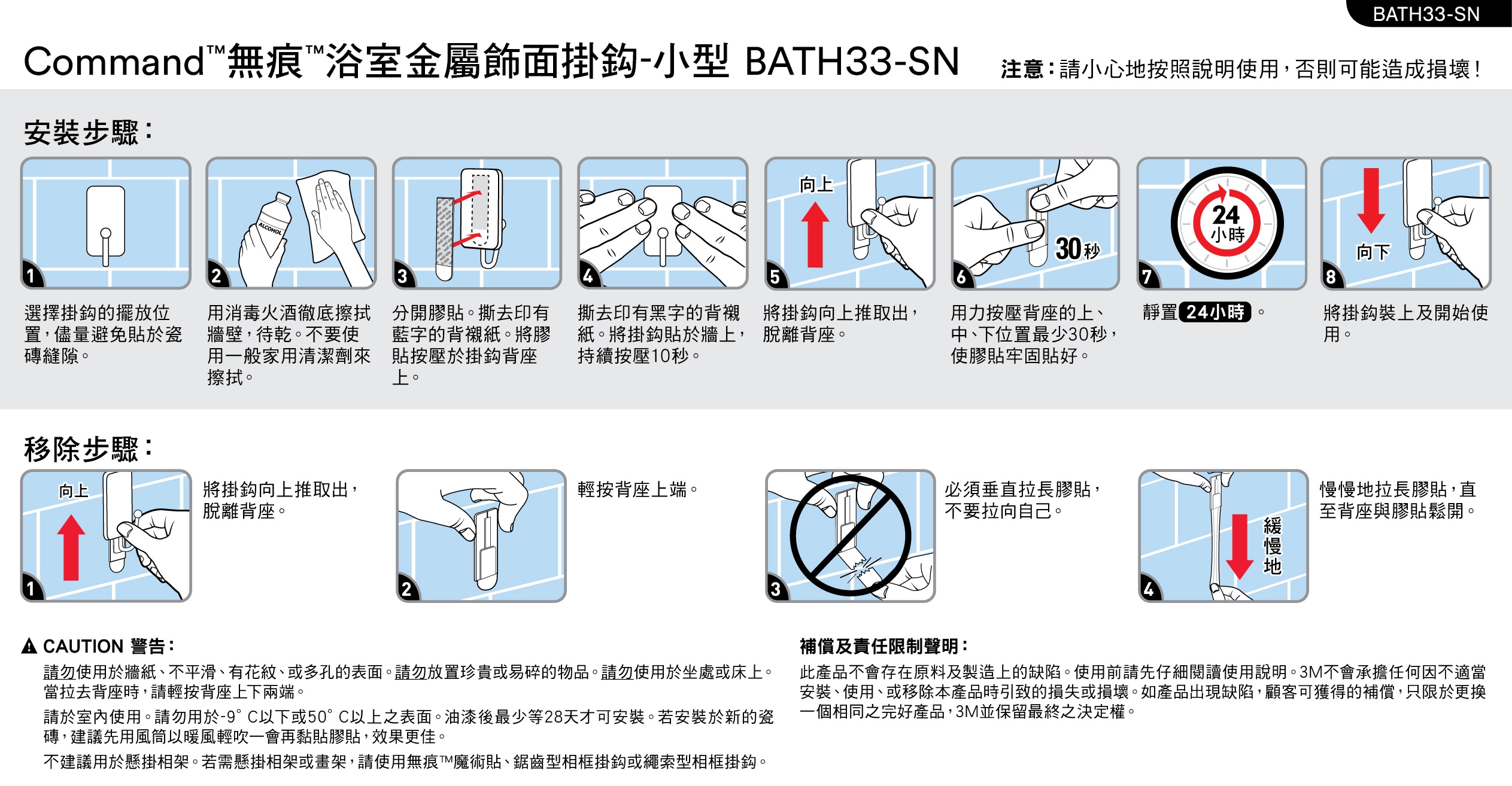 請勿使用於牆紙、不平滑、有花紋、或多孔的表面。請勿放置珍貴或易碎的物品。當拉去背座時,請輕按背座上下兩端。 請於室內使用。 請勿用於-10℃以下或50℃以上之表面。油漆後最少等28天才可安裝。若安裝於新的瓷磚,建議先用電風筒以暖風輕吹一會再黏貼膠貼,效果更佳。