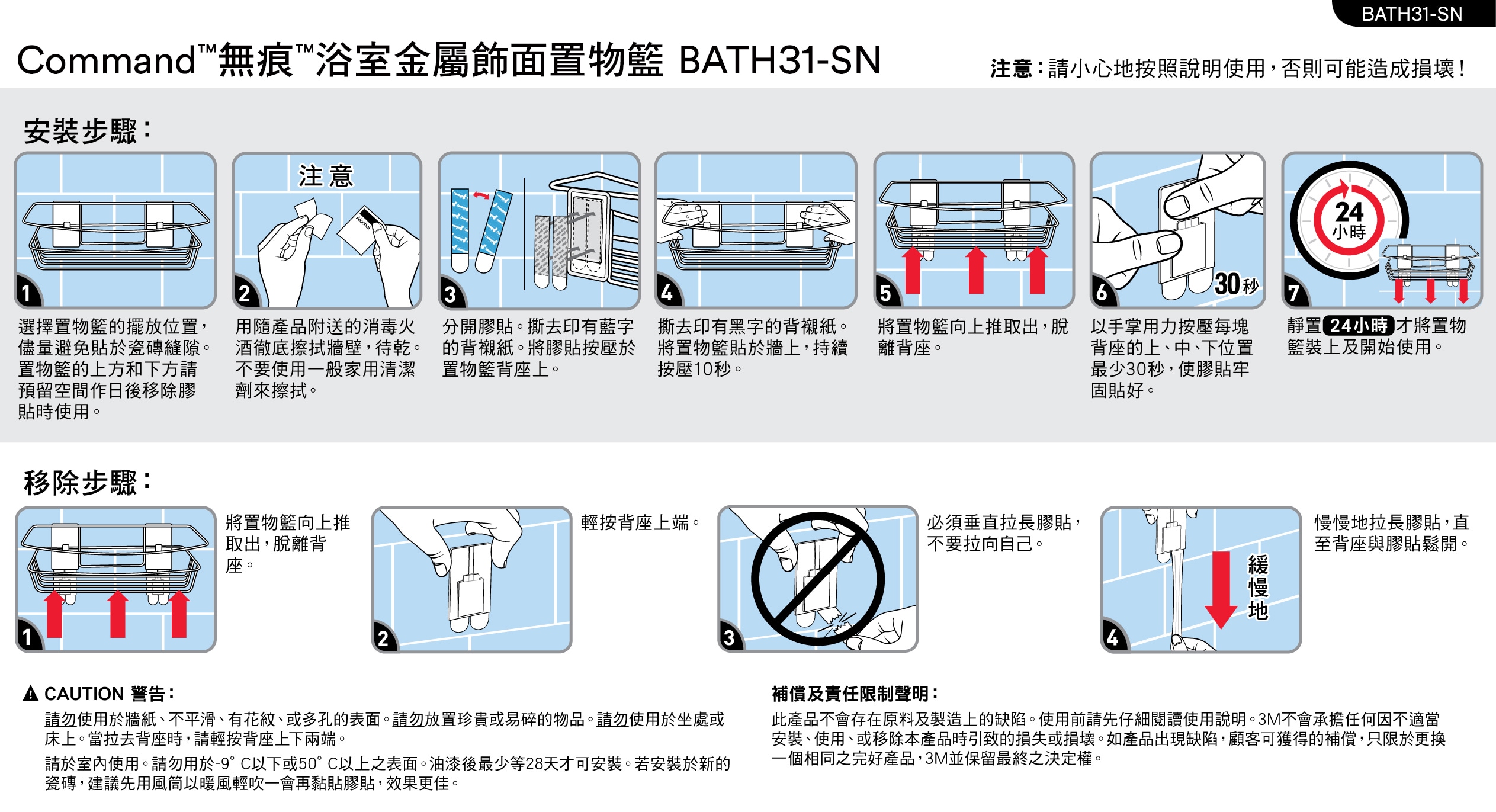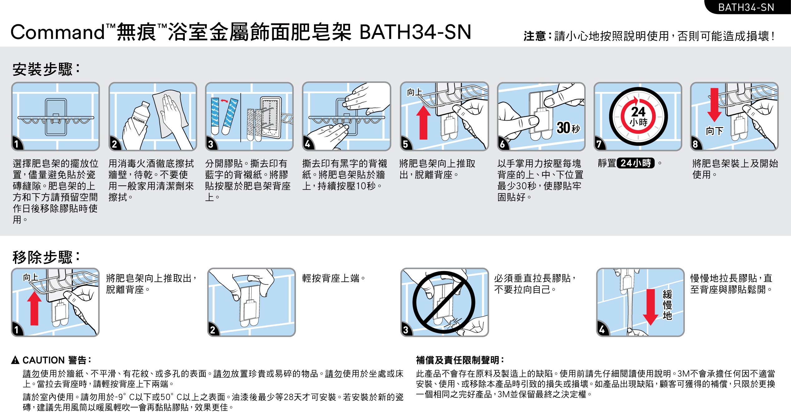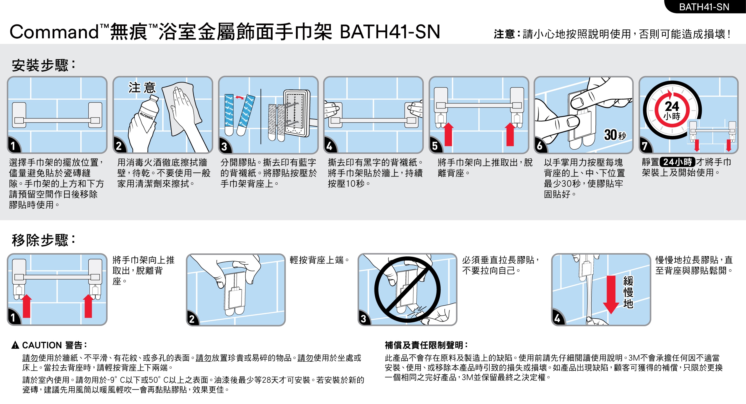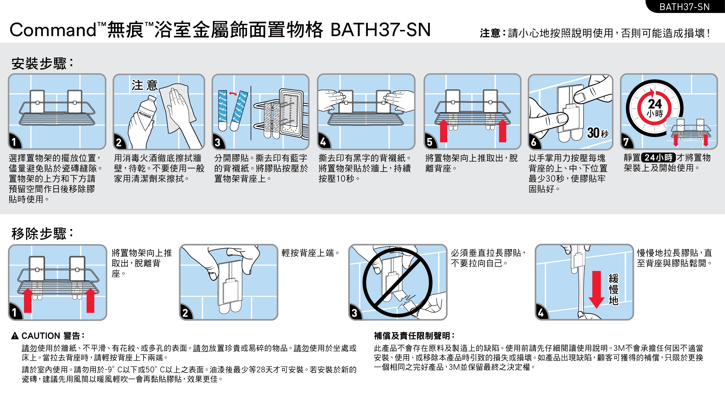 請勿使用於牆紙、不平滑、有花紋、或多孔的表面。請勿放置珍貴或易碎的物品。當拉去背座時,請輕按背座上下兩端。 請於室內使用。 請勿用於-10℃以下或50℃以上之表面。油漆後最少等28天才可安裝。若安裝於新的瓷磚,建議先用電風筒以暖風輕吹一會再黏貼膠貼,效果更佳。