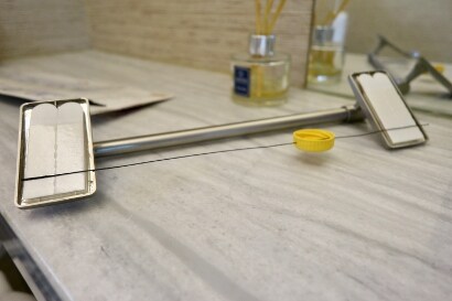 4)取出無痕™ 浴室防水金屬飾面手巾架,用鐵線/魚絲穿過樽蓋的小洞後,將鐵線貼在毛巾架的膠貼上。