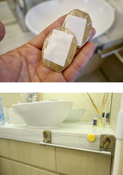 6)將已封好膠紙的兩個手仔標誌上貼上膠紙,然後再貼在毛巾架的左右兩側。小朋友洗手後可將樽蓋由污糟手仔標誌推向乾淨手仔標誌,任務完成!