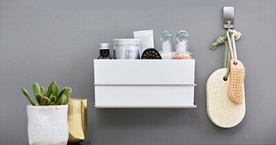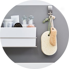 1. Mount a Command™ Bath Satin Nickel Wall & Cabinet Organizer to hold items such as soap and lotion and a Command™ Bath Small Satin Nickel Hook to hang up loofas at a reachable.