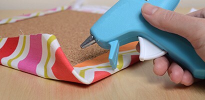 將軟木板倒置放在織物的背面。像禮物一樣折疊邊緣,然後將織物熱粘合到軟木板上。確實遵循熱熔膠槍製造商提供的說明和警告。