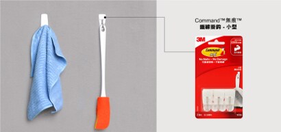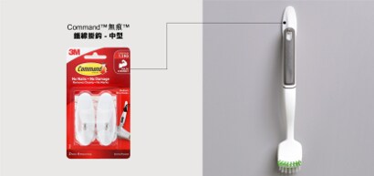 • Command™ 無痕™ 實用型中型掛鈎能夠承重3磅的物件(1.3 公斤),適合用以收納抹布、潔廁刷等。想改變位置,只需一拉就能移除,輕鬆不留痕跡,想在空間上收納更多物件,絕對不是難事!