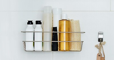步驟4. 最後,將洗頭水、沐浴乳和其他用品放置在無痕™ 浴室防水金屬飾面置物籃,讓淋浴時刻更流暢放鬆。