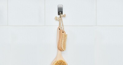步驟1. 在淋浴間牆上安裝無痕™ 小型浴室防水金屬飾面掛鈎,以掛起刷子和絲瓜絡。