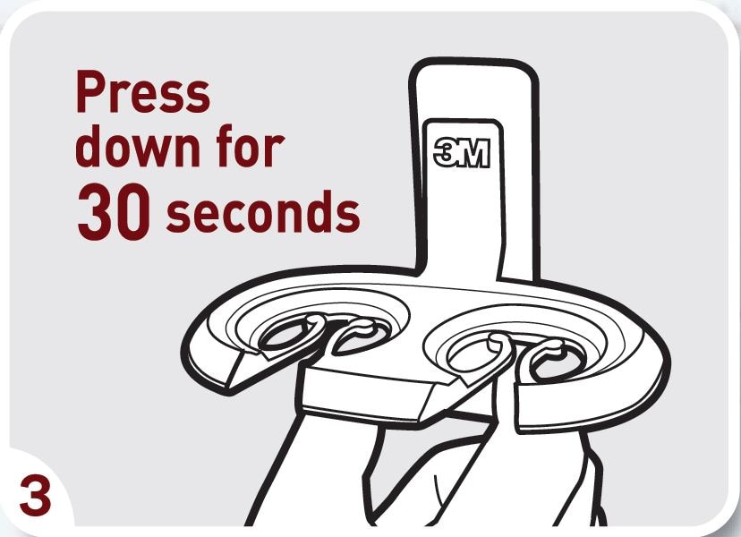 為達最佳黏貼效果,用力按壓背座的上、中、下位置不少於30秒。