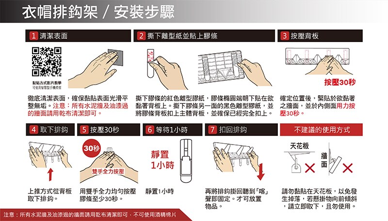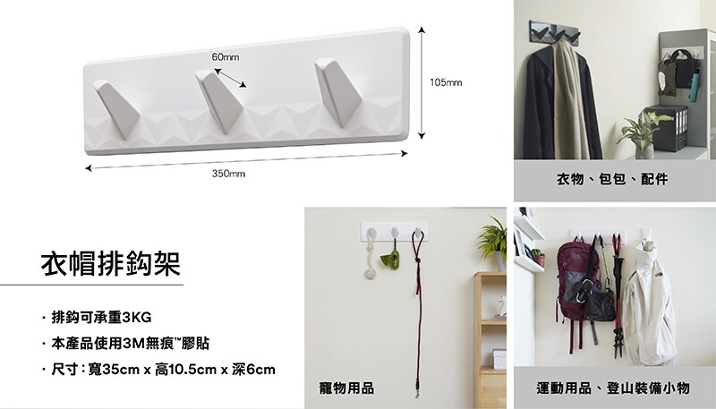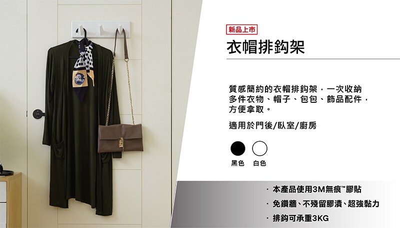 • 衣帽排鈎架可承重3公斤,使用4片無痕™大型膠貼